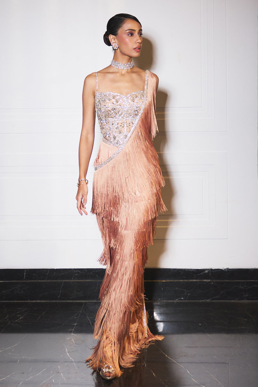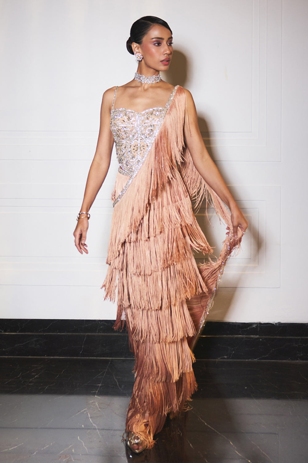 Nude pre-draped saree with diamonté embroidered corset and fringe detailing featuring 100% hand embroidery in diamonté and crystals. Lycra, tulle, and fringe fabrics. Ready to wear for weddings and celebrations.